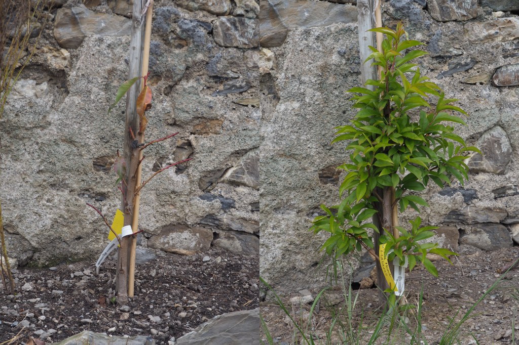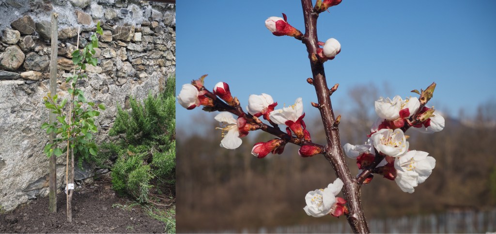 Daneben stand während drei Jahren ein Aprikosenbaum, welcher immer wieder schön blühte und auch sehr schmackhafte, leuchtend orange Aprikosen trug. Leider ist er letzten Frühling abgestorben – mal sehen, was als nächstes dort stehen wird.